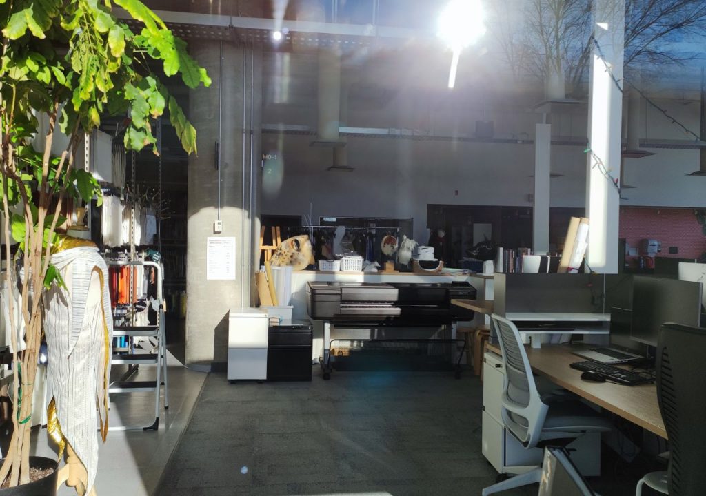 Me quedé unos segundos en silencio. Después hice lo único que podía hacer: rodeé el edificio completo. La fachada, casi enteramente de vidrio, dejaba ver los talleres de vestuario: mesas largas, telas vibrantes, maniquíes vestidos con formas imposibles. No tuve que imaginar cómo se construye la fantasía. Estaba ahí, a pocos metros, detrás de un vidrio helado. Yo avanzaba pegándome a cada ventana, como si así pudiera absorber algo de esa energía creativa.